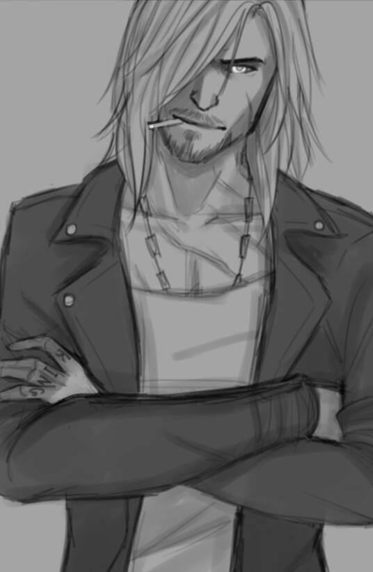 ➤➤ His stomach is also riddled with knife and bullet wounds➤ He has a raspy, ruined voice➤The scent of motor oil clings to him like a bad habit